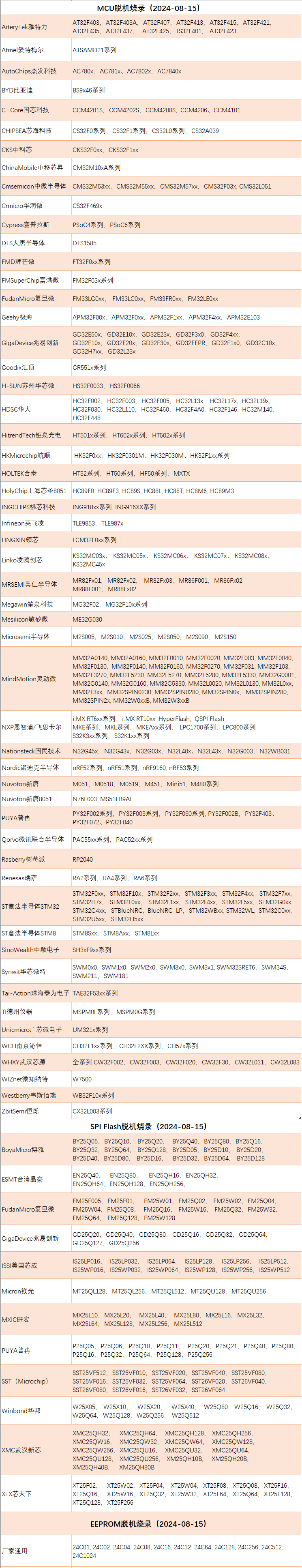 9、当前支持的脱机烧录完整列表如下