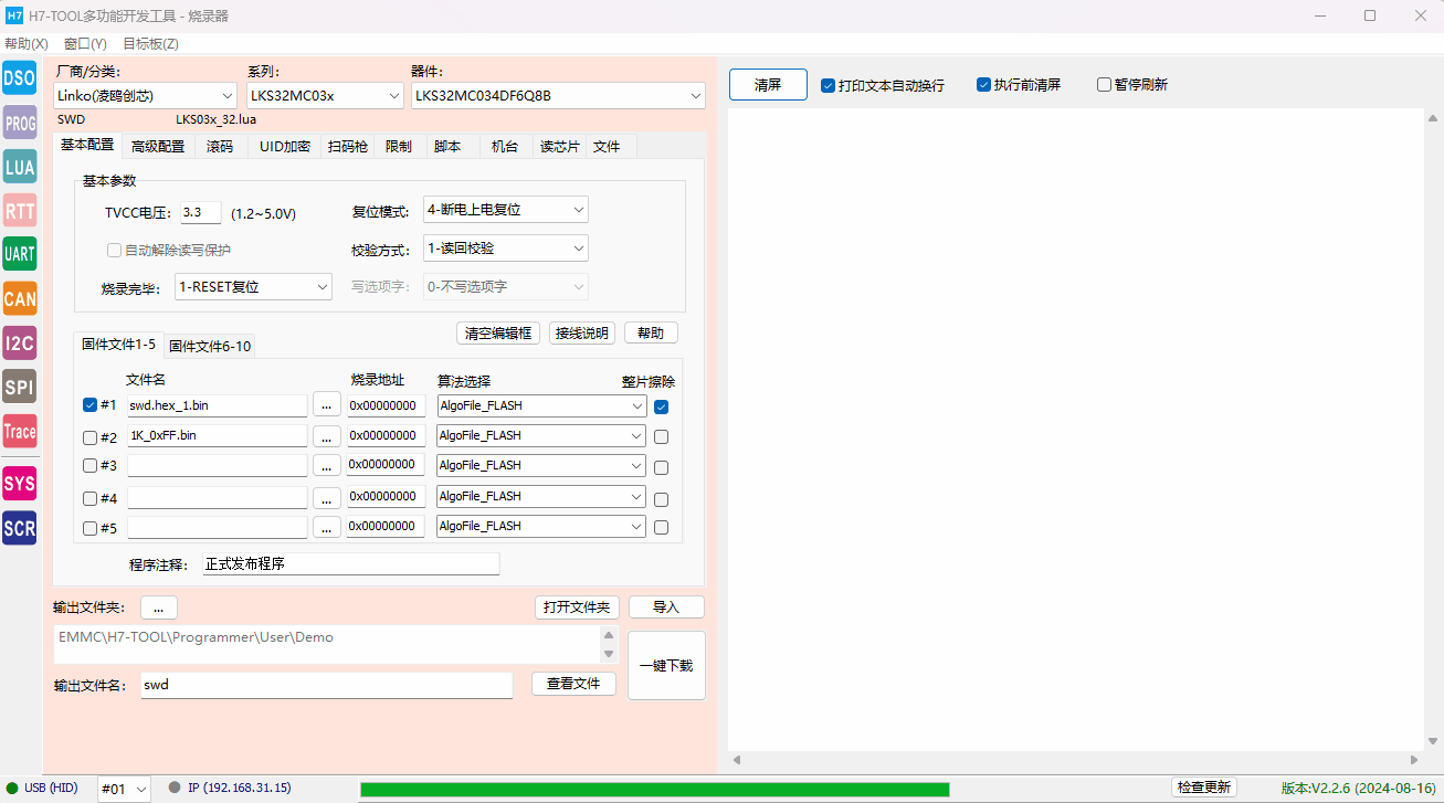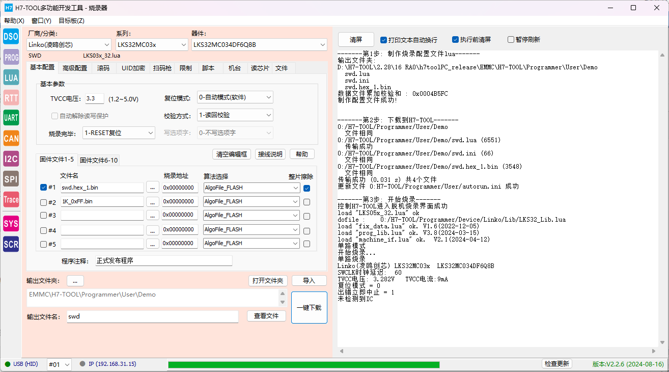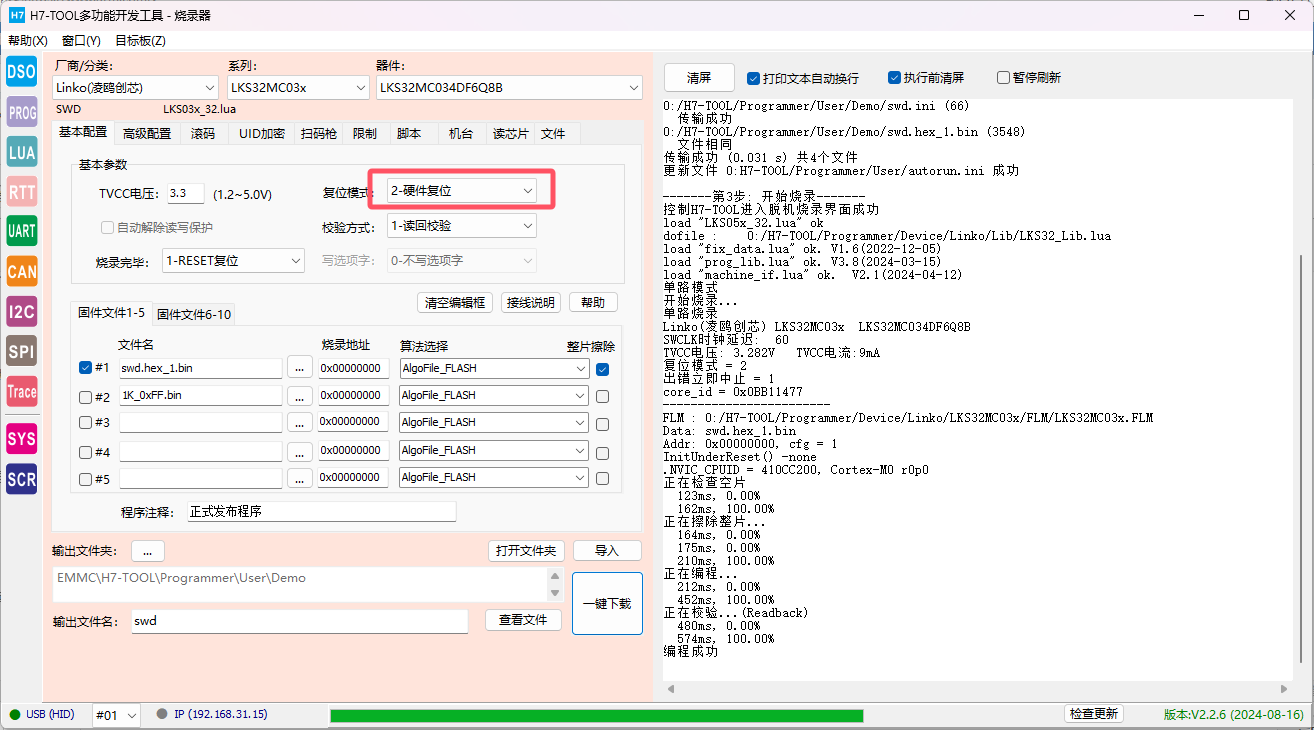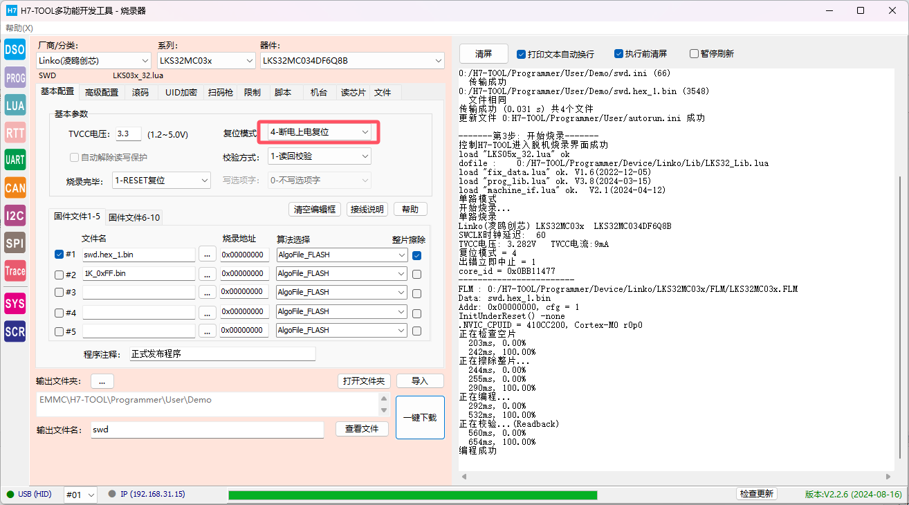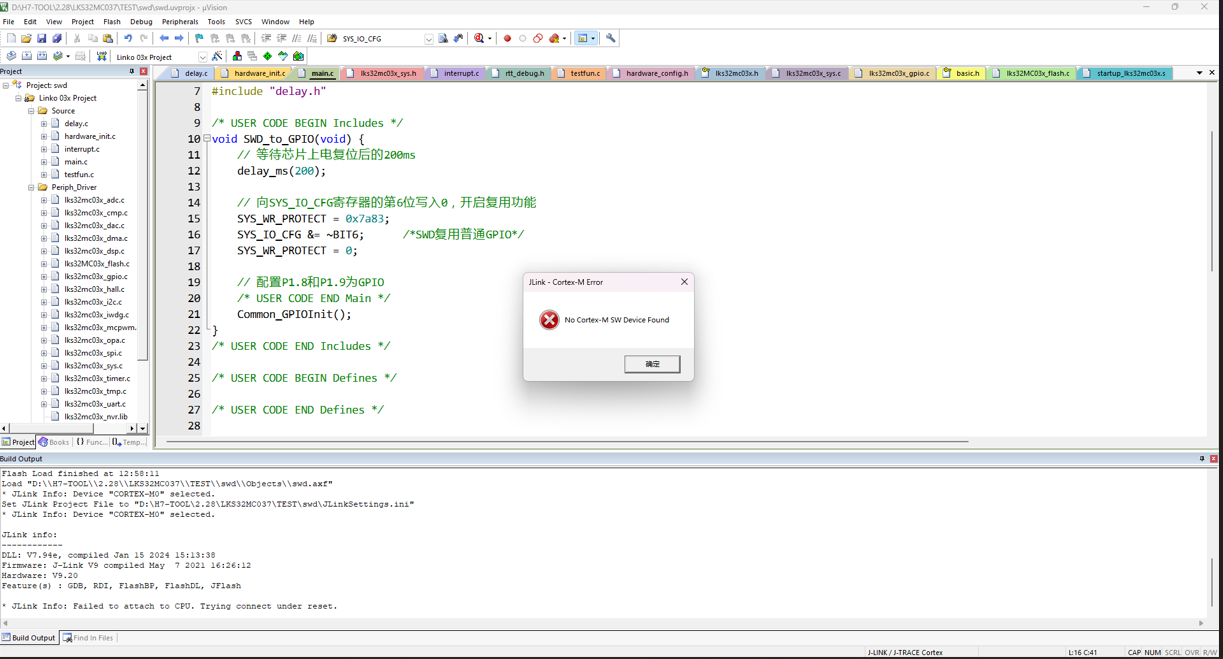 虽然客户的程序搞了个上电后延迟100ms才复用,但JLINK,ULINK,STLINK,DAPLINK在MDK下都已经无法控制这个芯片下载,但使用第3方的烧录可以下载,且客户近期不方便提供他的测试程序让我们测试。 【解决办法】 1、测试代码, 使用芯片LKS32MC034DF6Q8B