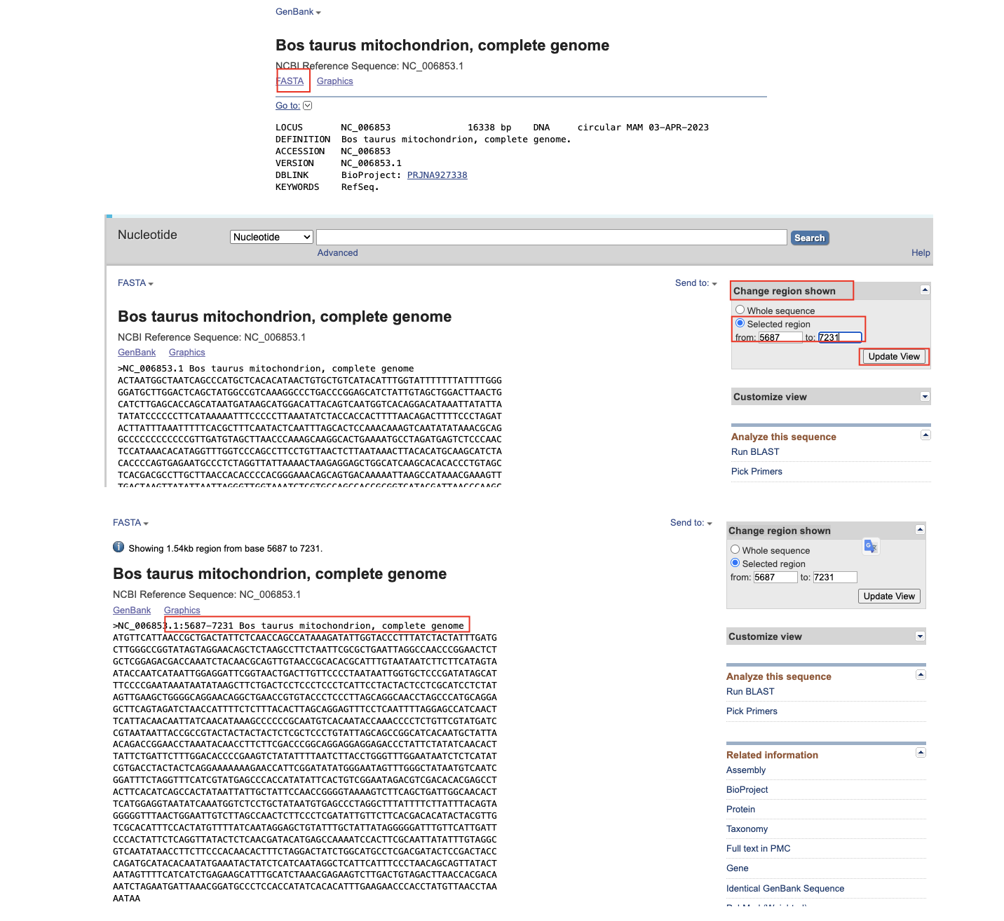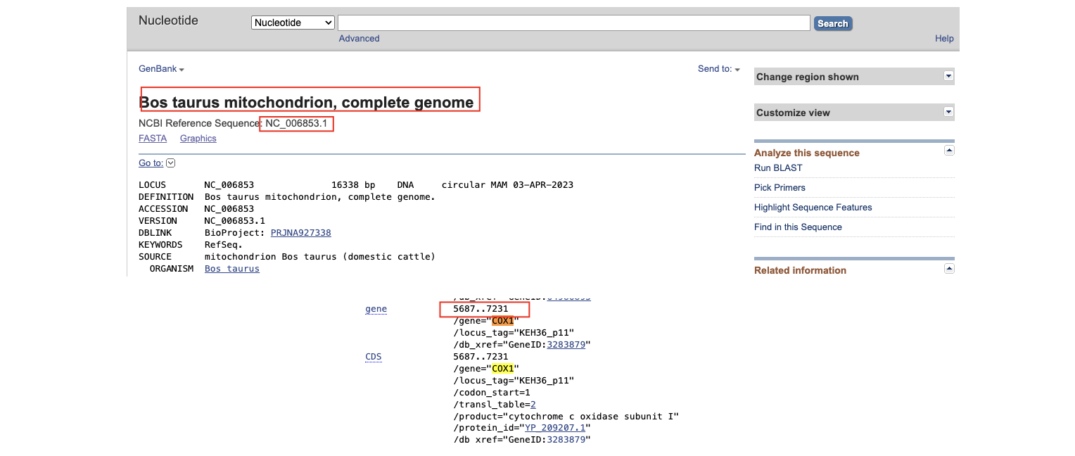 Bos taurus | 牛 | NC_006853.1 | 5687-7231 | 牛的完整线粒体基因组,RefSeq 收录,常用作物种鉴定标准序列。 |