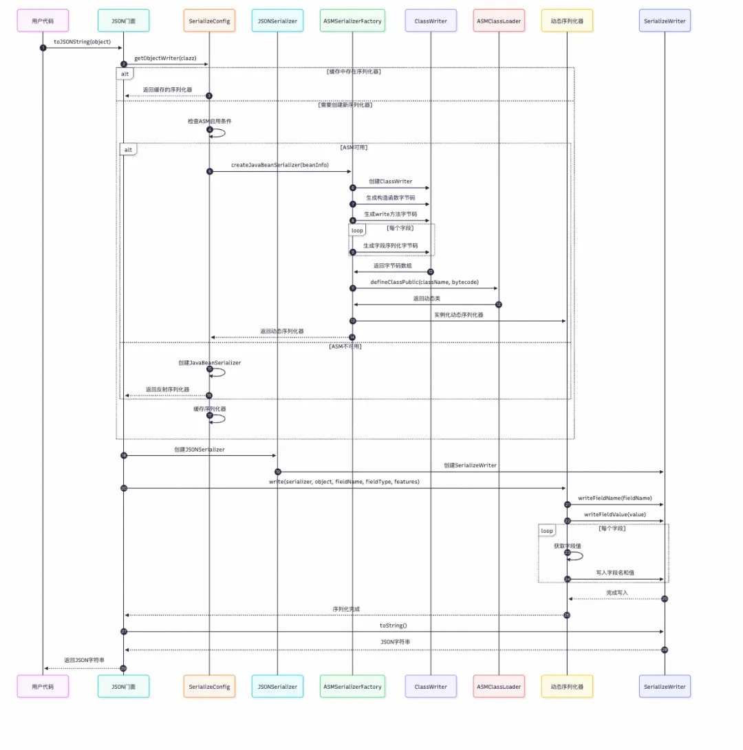 序列化步骤主要包括:序列化器查找→JavaBean字段解析→字段值转换和JSON字符串构建等过程。下图为序列化处理时序图: