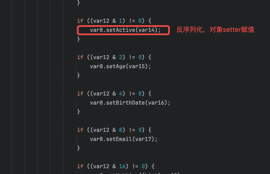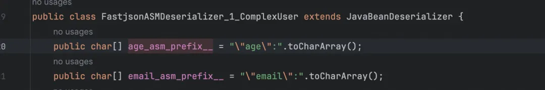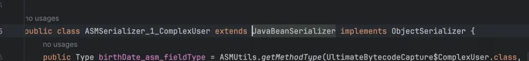 ASM 是 fastjson 类似于 JIT,在运行时把「反射调用」翻译成「直接字段访问 + 方法调用」的字节码,从而把序列化/反序列化性能提升 20% 以上,当然随着JVM对反射性能的优化性能差正在逐渐被缩小。下图是作者使用工具类读取的动态序列化/反序列化器源码片段。