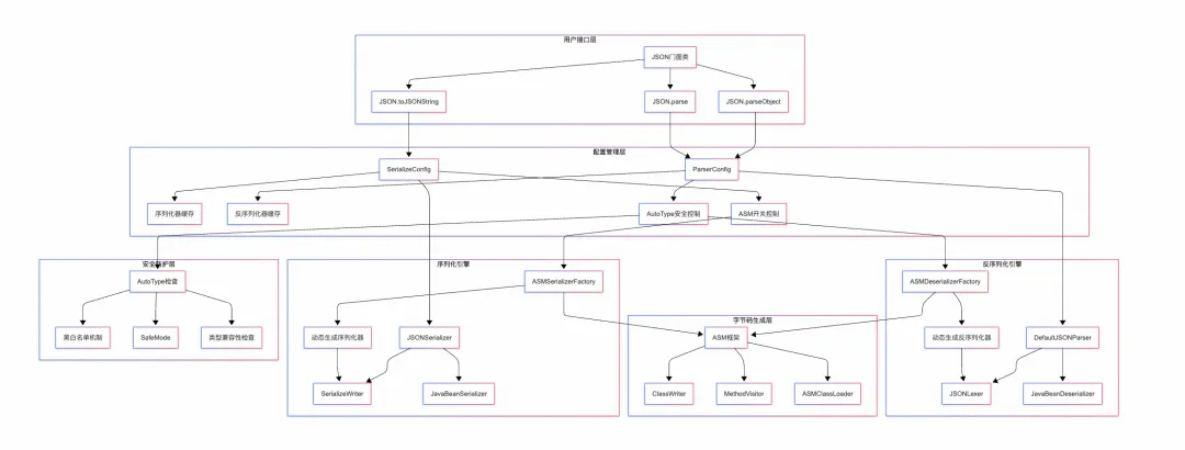 从高层次视图看Fastjson框架的结构,主要可以分为用户接口层、配置管理层、序列化引擎、反序列化引擎和安全防护层。其中用户接口提供了门面类用户编码直接与门面类交互,降低使用复杂度;配置管理层允许用户对框架行为进行配置;序列化引擎是序列化操作的核心实现;反序列引擎是反序列化操作的核心实现;安全模块解决框架安全问题,允许用户针对安全问题设置黑白名单等安全检查功能。下图为Fastjson模块关系图: