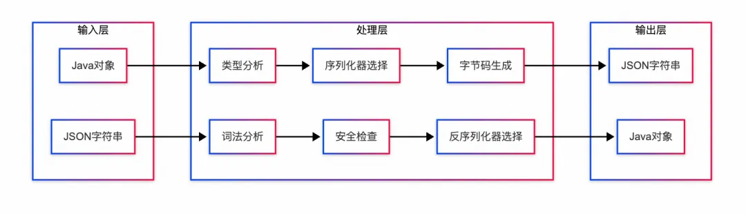 整体上Fastjson通过统一的门面API(JSON.toJSONString/parseObject)调用核心控制器(JSONSerializer/DefaultJSONParser),利用ASM字节码生成或反射机制,配合SerializeWriter/JSONLexer进行高效的Java对象与JSON字符串间双向转换,同时提供配置缓存、循环引用检测和AutoType安全防护等优化机制。下图为框架处理数据流: