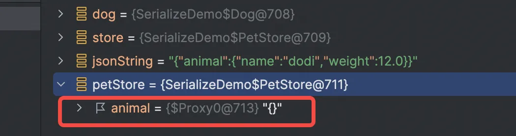 在未开启AutoType机制情况下,在将store对象序列化成JSON串后,再反序列化为对象时由于字段的类型为接口无法转换成具体的Dog类型示例;开启AutoType机制后,序列化时将类型一并写入到JSON串内,后续进行反序列化时可以根据这个类型还原成具体的类型实例。