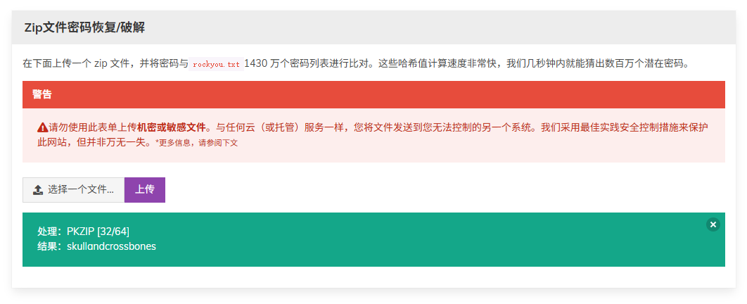 这个压缩包的密码直接用rockyou字典爆破就能得到,是个常见弱密码。不用kali的也可以用这个在线网站进行爆破,得到密码为“skullandcrossbones”。解压缩后得到答案。(后续发现这个密码还有另外一个解法,但是过于麻烦这里我不详细讲了,有兴趣可以看看这个师傅的wp)