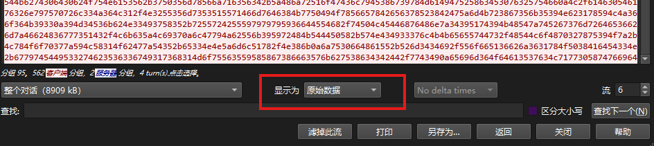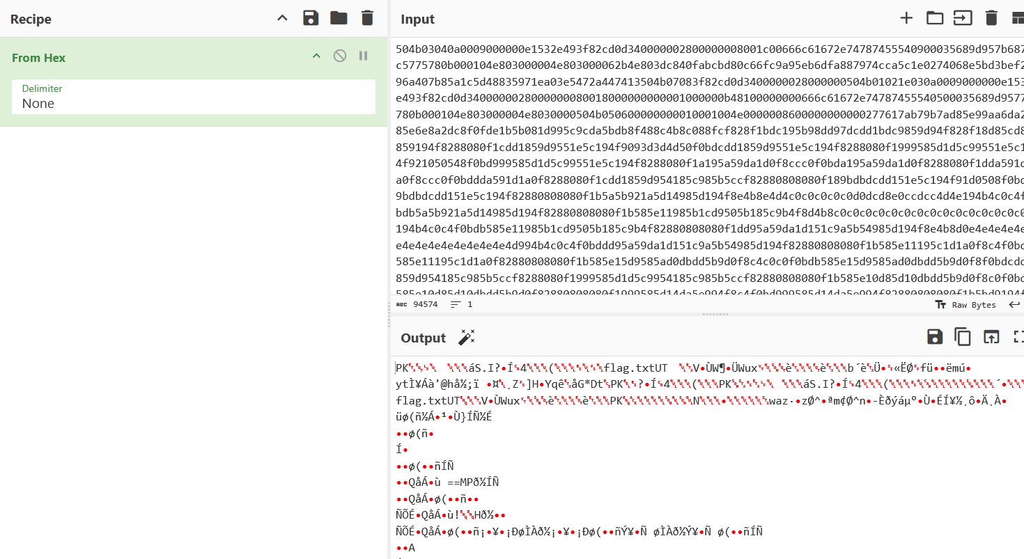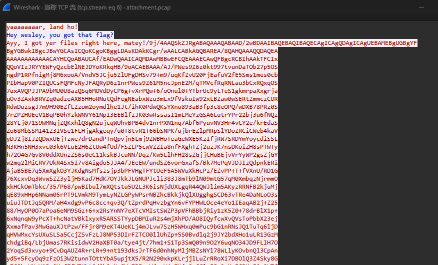 题目文件是个pcap日志文件,用wireshark打开。只有TCP,TLS数据,导出文件的方法不适用了,右键追踪TCP流,发现了一大块base64的编码。通过把数据切换成原始数据并导出到CyberChef进行解码。