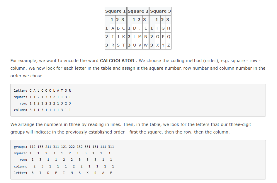 这张图片很好的说明了三分密码的原理和解密方式,对于比较少的数据我们直接通过表格坐标就可以精确的把数字转换为原来的英文字母。