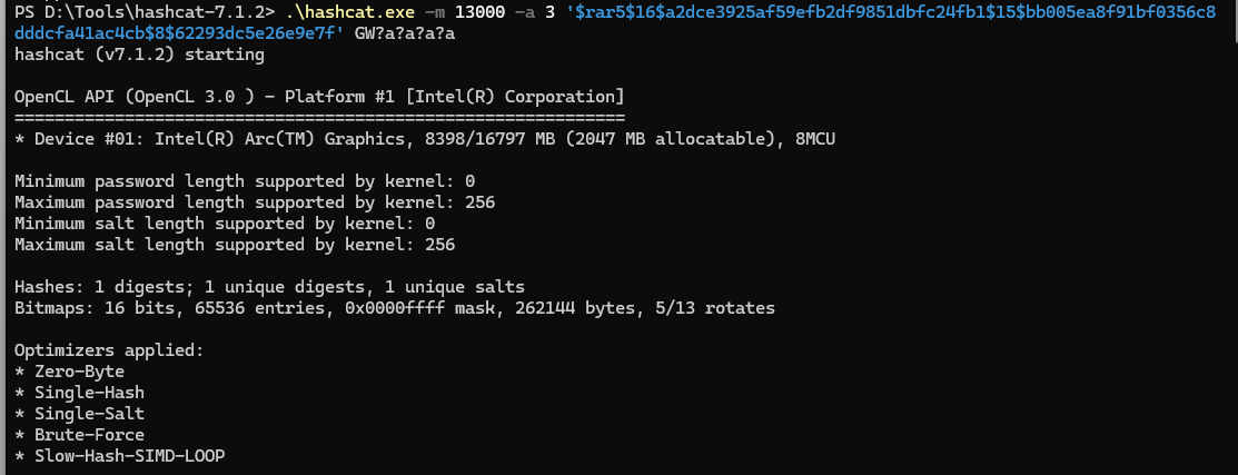 .\hashcat.exe -m 13000 -a 3 '$rar5$16$a2dce3925af59efb2df9851dbfc24fb1$15$bb005ea8f91bf0356c8dddcfa41ac4cb$8$62293dc5e26e9e7f' GW?a?a?a?a
