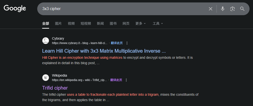 UJM IKO LP/当我们遇到没有见过的密码时,可以通过搜索改密码的一些特征来找到具体或者近似的密码算法。比如这里的密码就像是一个3x3的矩阵,在搜索引擎上搜索“3x3 cipher”,很快就找到对应的密码,也就是三分密码(Trifid cipher)。