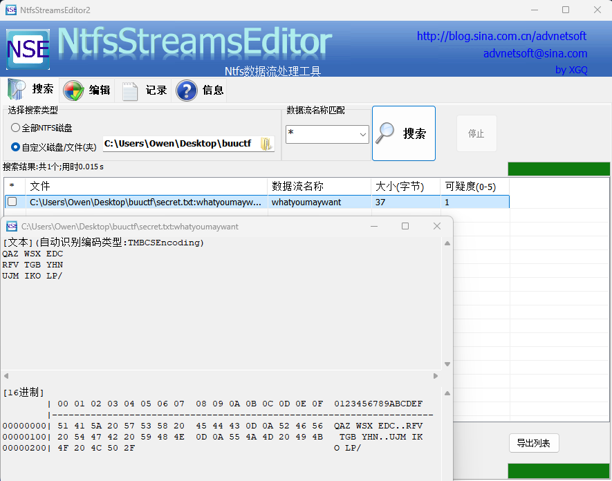 挂载后得到一个文本文件,表示没有flag。说明我们需要找到隐藏密码从而挂载隐藏的磁盘数据。对于单独的文本文件来说,最先想到的就是NTFS隐藏数据流。我们通过NtfsStreamsEditor工具进行目录扫描,果然发现了新的文本。