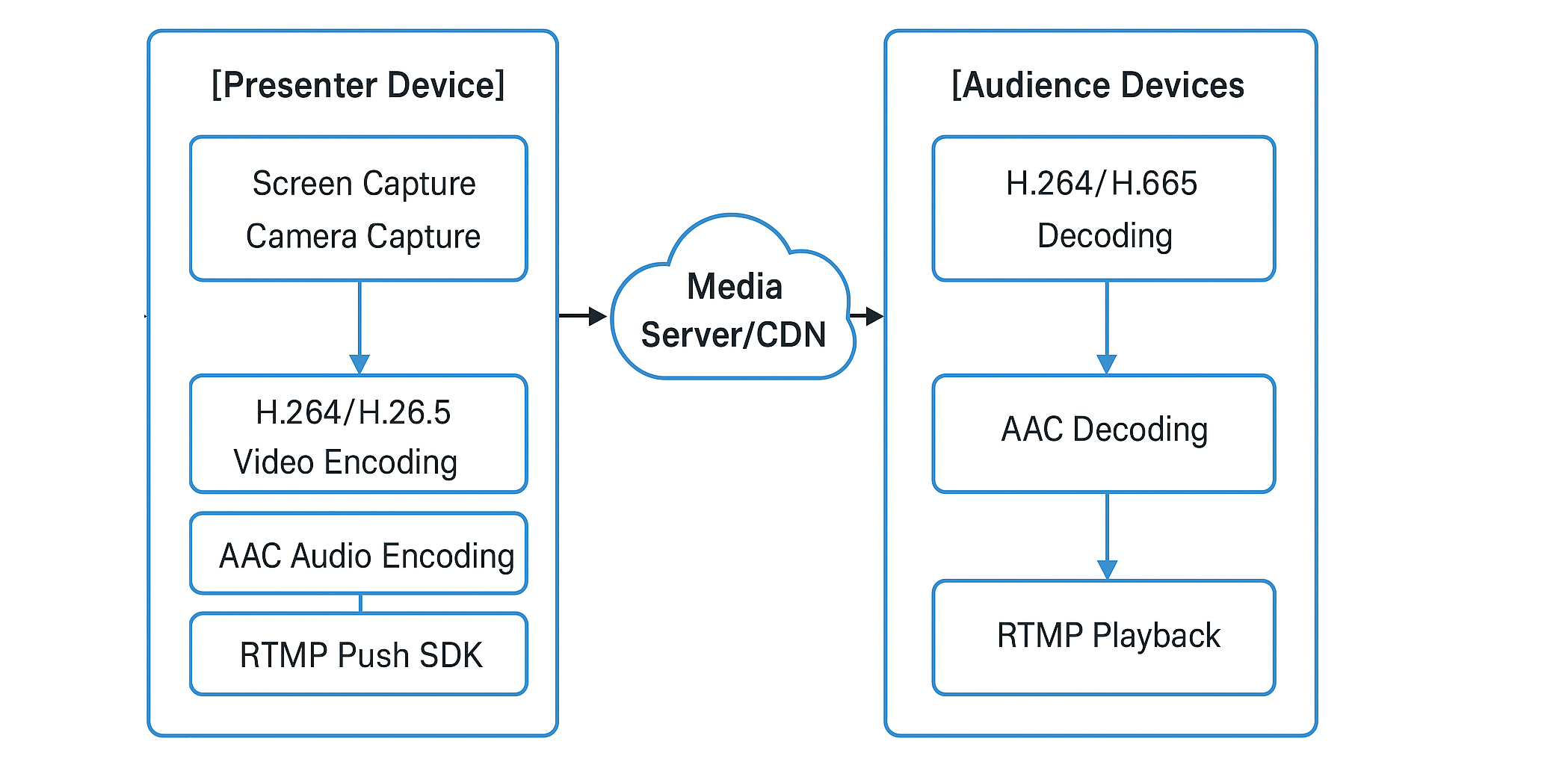 推流采集(摄像头/屏幕) | 教师端授课、演示 | 软硬编码切换、低延迟、弱网自适应 |