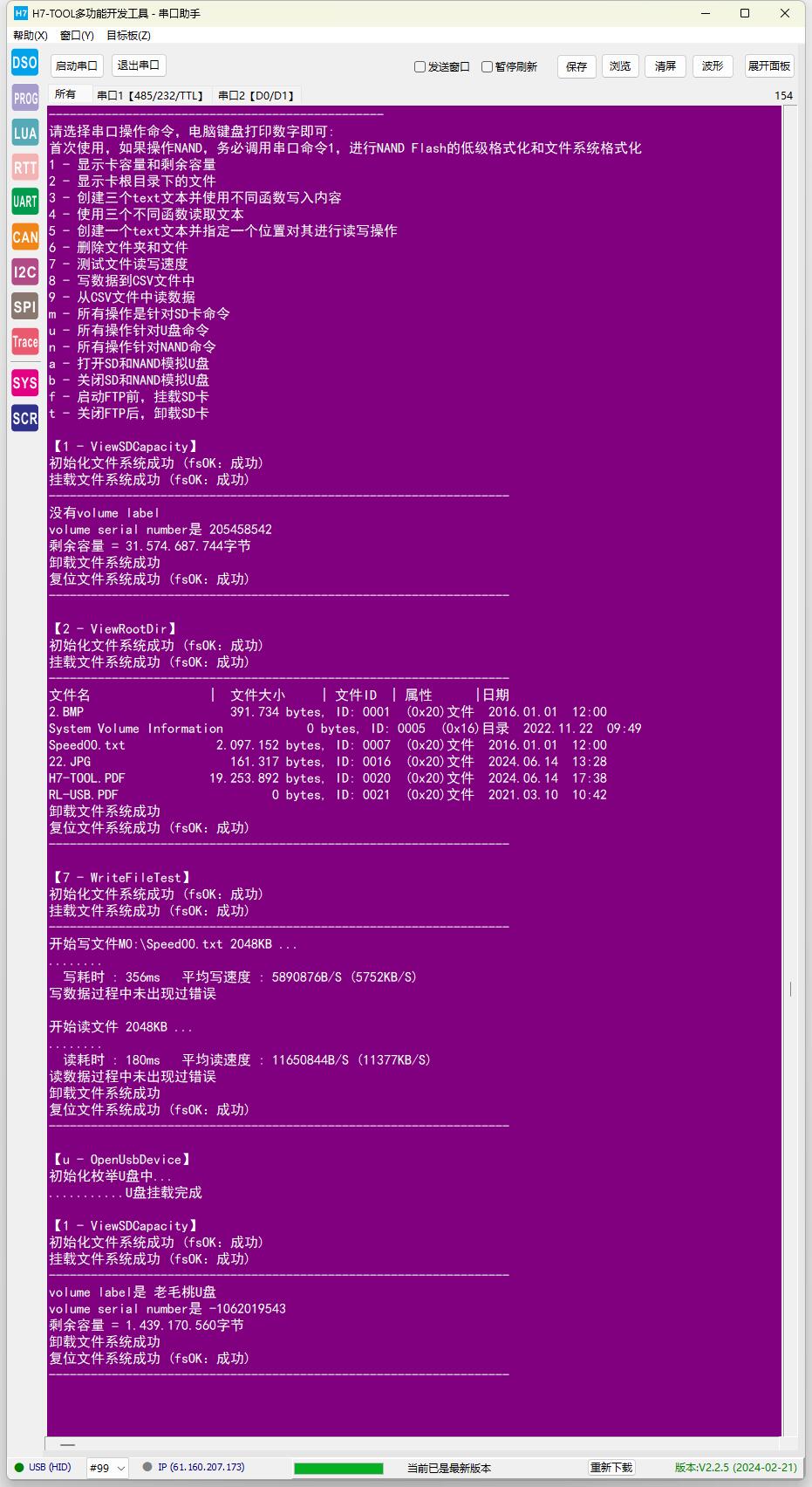 请选择串口操作命令,电脑键盘打印数字即可 ("首次使用,如果操作NAND,务必调用串口命令1,进行NAND Flash的低级格式化和文件系统格式化\r\n"); ("1 - 显示卡容量和剩余容量\r\n"); ("2 - 显示卡根目录下的文件\r\n"); ("3 - 创建三个text文本并使用不同函数写入内容\r\n"); ("4 - 使用三个不同函数读取文本\r\n"); ("5 - 创建一个text文本并指定一个位置对其进行读写操作\r\n"); ("6 - 删除文件夹和文件\r\n"); ("7 - 测试文件读写速度\r\n"); ("8 - 写数据到CSV文件中\r\n"); ("9 - 从CSV文件中读数据\r\n"); ("m - 所有操作是针对SD卡命令\r\n"); ("u - 所有操作针对U盘命令\r\n"); ("n - 所有操作针对NAND命令\r\n"); ("a - 打开SD和NAND模拟U盘\r\n"); ("b - 关闭SD和NAND模拟U盘\r\n"); ("f - 启动FTP前,挂载SD卡\r\n"); ("t - 关闭FTP后,卸载SD卡\r\n");