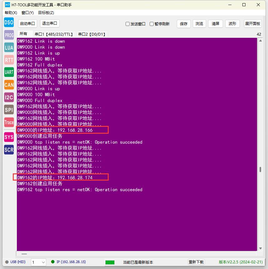 (1)强烈推荐将网线接到路由器或者交换机上面测试,因为已经使能了DHCP,可以自动获取IP地址。获取的IP地址会通过串口打印出来。 (2)DM9000和DM9162分别创建了一个TCP Server,DM9000使用端口号1002,而DM9162使用端口号1001。用户可以在电脑端用网络调试软件创建TCP Client连接此服务器端。 (3)按键K1按下,DM9162发送数据给TCP Client。 (4)按键K2按下,DM9000发送数据给TCP Client。 (5)如果使用固定IP请看双网卡教程附件章节进行设置:https://www.armbbs.cn/forum.php?mod=viewthread&tid=100233