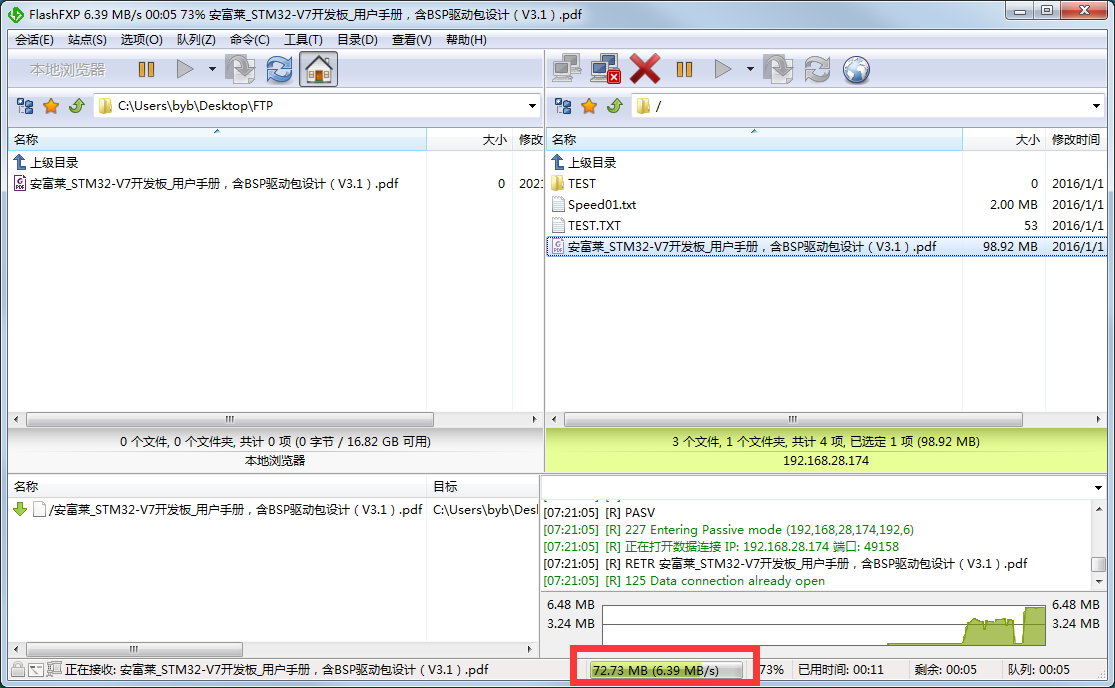 1、由于程序使用了DWT时钟周期计数器,程序下载后,请将板子重新上电使用,防止DWT时钟周期计数器没有正常复位。 2、RL-FlashFS操作外挂U盘,SD卡或者NAND,是通过串口命令u,m和n来切换,m表示SD卡,n表示NAND,u表示U盘。 3、首次使用,如果操作NAND,务必调用串口命令1,进行NAND Flash的低级格式化和文件系统格式化。 4、使用FTP服务器前,请插入SD卡,执行串口命令f,不使用FTP功能后,请执行串口命令t。 (1)FTP服务器请使用FlashFXP 5,而使用FileZilla Client不好用。 (2)FTP用户名admin,密码123456,端口21。
