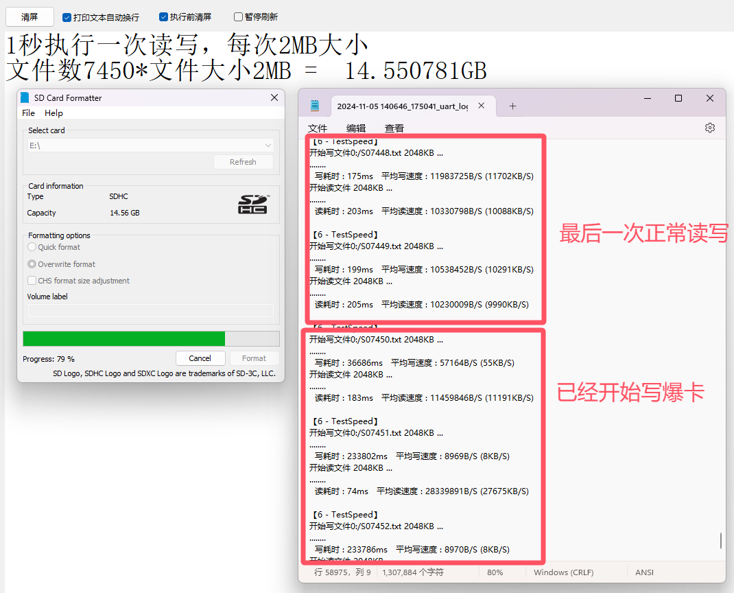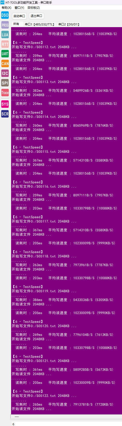 运行例子里面的命令6,命令6是个测速函数,每次写入2MB文件,同时读取出来校验,保证写入的没问题。