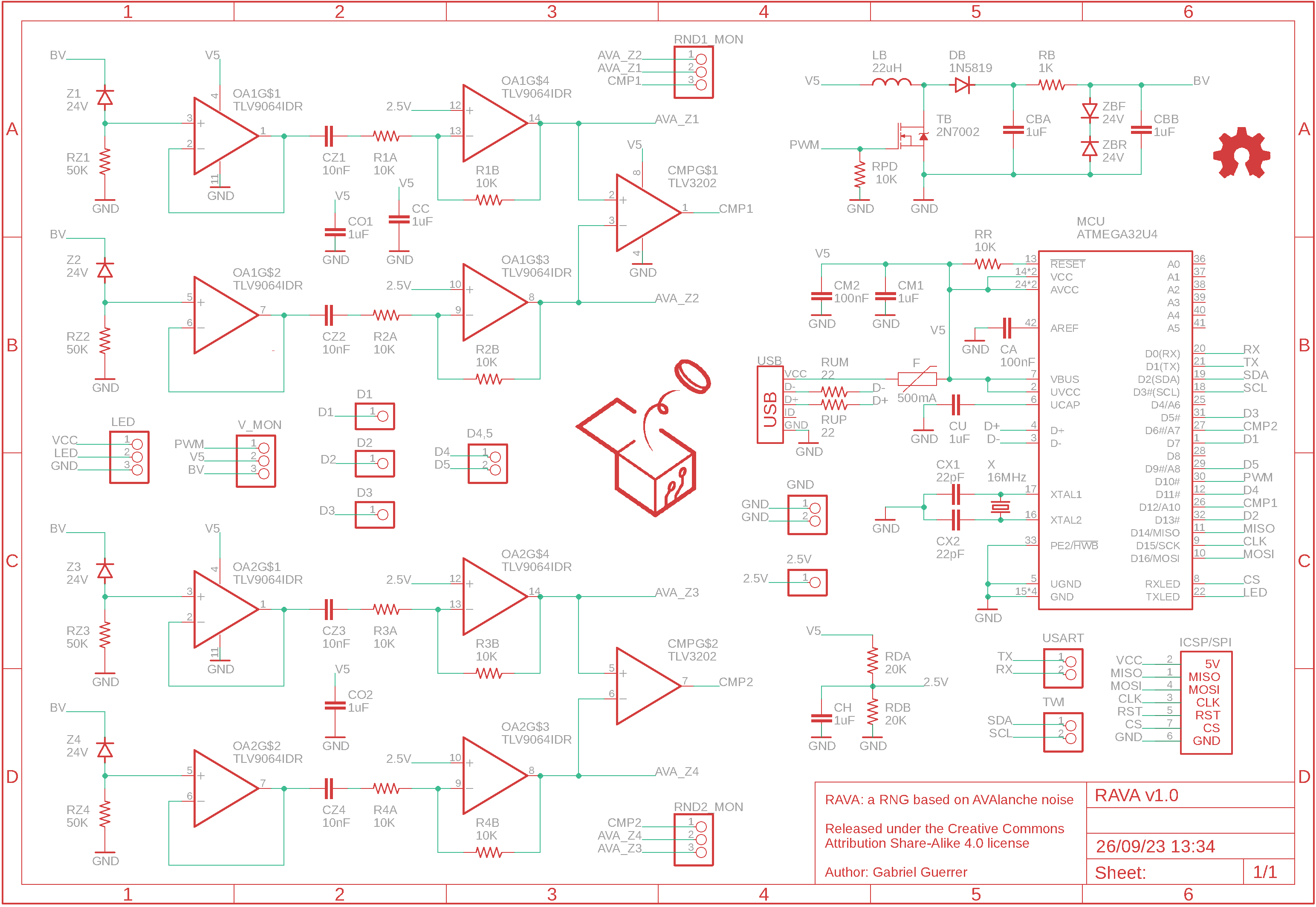 基于一种在许多电子设备中常见的特性——雪崩击穿。雪崩击穿发生在反向偏置方向施加高电压(在本例中约为25V)时,该设备使用了一对齐纳二极管。当施加高电压时,电子会发生“雪崩”现象,使二极管在反向偏置时导通。然而,这并不是一个恒定的电流;随着时间的推移,电流会有微小的变化,这些变化可以被放大并用作随机数生成器。噪声通过一系列运算放大器放大后,传输到ATmega32U4微控制器,从而为用户提供136.0 Kbit/s的随机数据。