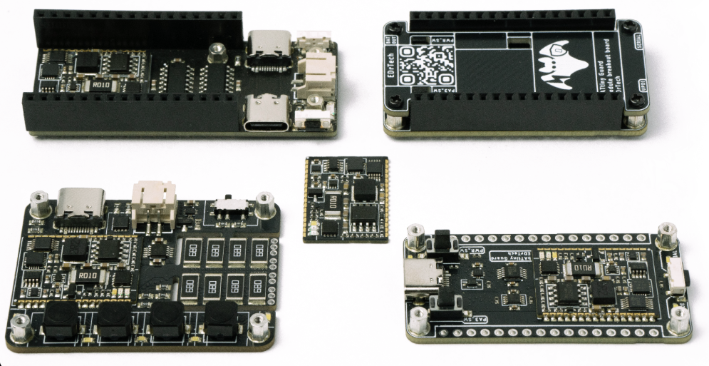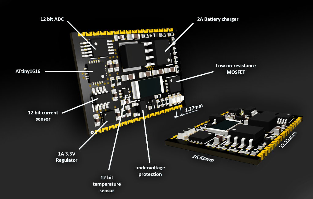 bATtiny Guard 是一款高度集成的模块,专为高效管理单节锂聚合物电池系统而设计。它集成了多种必要的集成电路,全面解决电源管理的各个方面,包括电池充电、开关/按钮的开关机行为、欠压和过压保护、灵活的电压测量、电池电流测量以及温度监控。此外,该模块还配备了一个微控制器,可编程自定义行为,确保对单节可充电电池系统的全面管理。更重要的是,当与演示套件基板配对时,该模块可作为 ATTINY1616 的通用开发板,所有 18 个 GPIO 引脚均可用于任何应用。