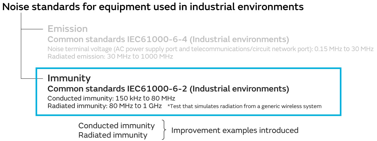 近年来,制造业现场的自动化技术取得了显著发展。因此,专家们预计,在使用机器人及其外围设备等工业设备的设施中,噪声问题将会增加。其中一个问题是由其他设备的外部噪声或机器内部电路产生的声音引起的故障。因此,对噪声的抗干扰能力——即对噪声的抵抗力——的关注变得越来越重要。