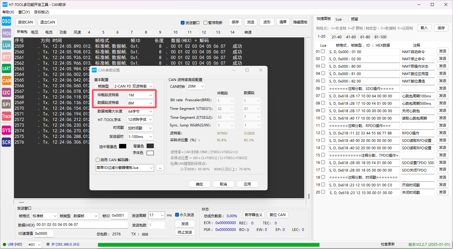 4、实测CANFD仲裁段1MHz,数据段2MHz速度,设备连续不间断发送,每秒上万帧数据,TOOL实时接收1200万帧正常不丢包