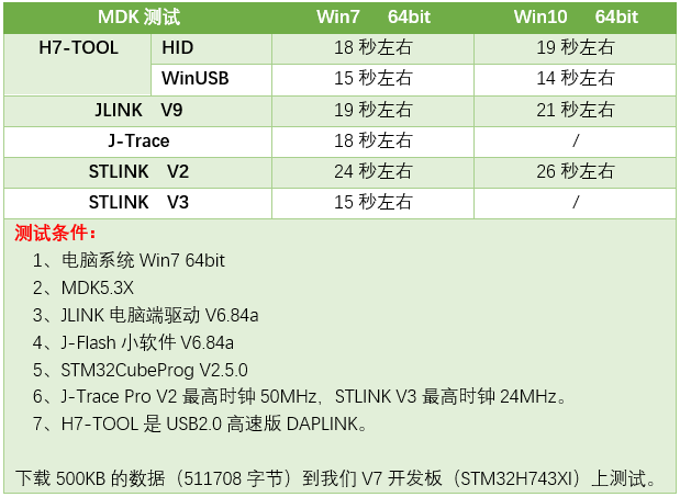 H7-TOOL DAPLINK,J-Trace,JLINK V9,STLINK V2,STLINK V3下载速度测试比较