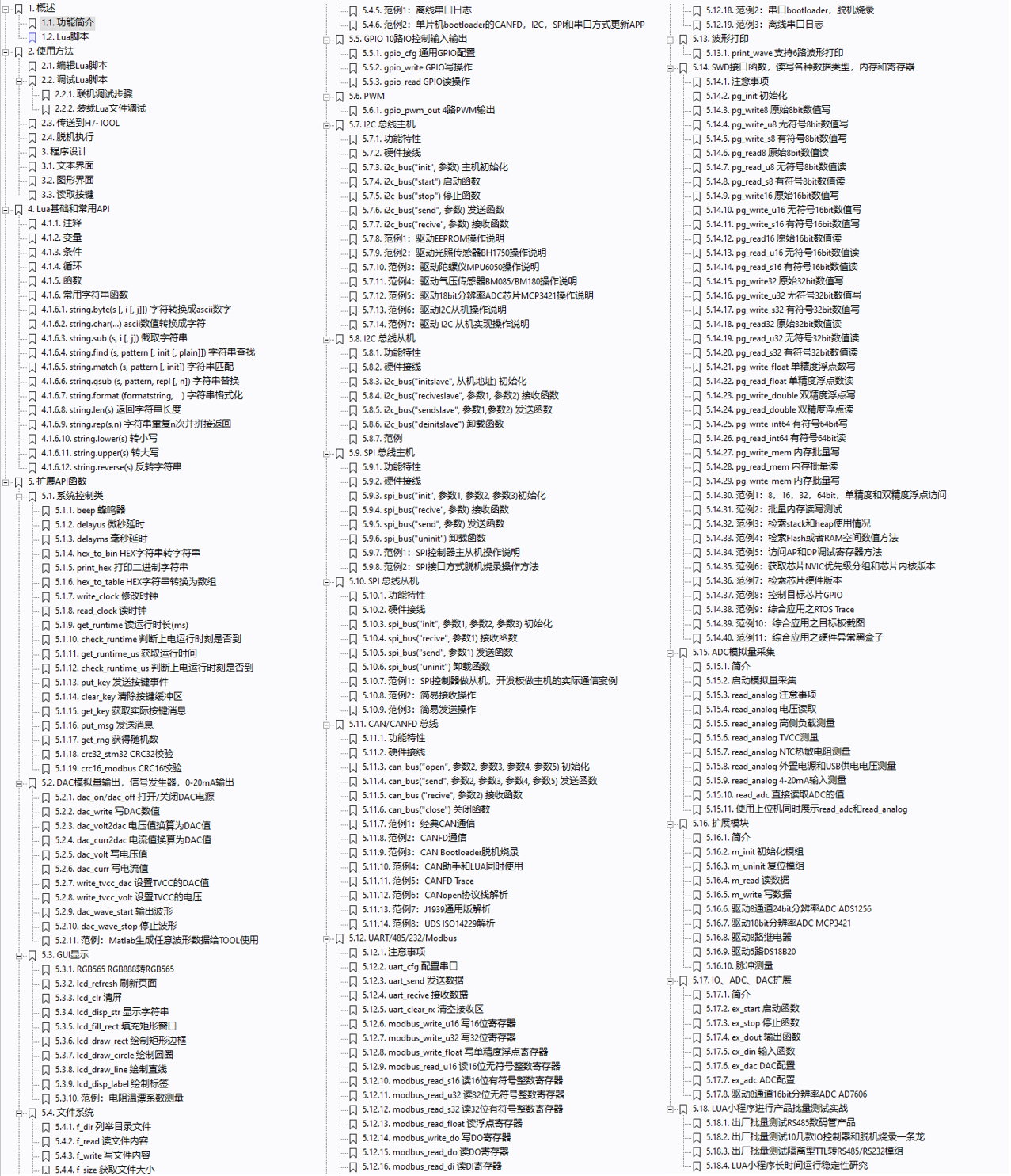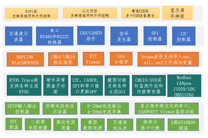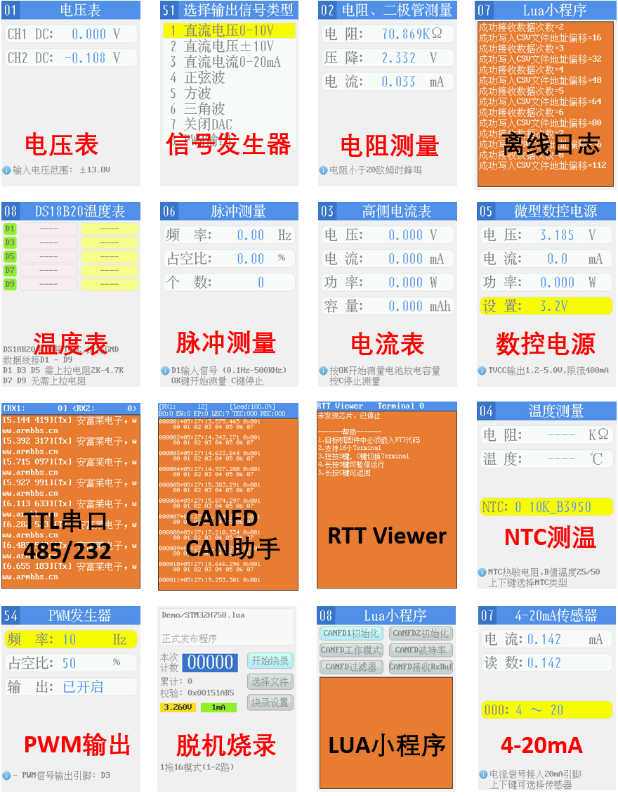(1) 系统控制函数 (2) 信号发生器 (3) 4-20mA输入输出 (4) GUI显示 (5) 文件系统 (6) 10路GPIO控制 (7) 4路PWM (8) 脱机烧录控制 (9) I2C主机从机 (10) SPI主机从机 (11) 电压电流采集 (12) 串口/232/485/Modbus,支持离线日志 (13) CAN/CANFD/CANopen/UDS/J1939 (14) NTC热敏电阻 (15) 微型数控电源 (16) 支持IO扩展 (17) 支持传感器扩展 (18) 支持脉冲测量 (19) SWD调试接口函数,读写各种类型数据,内存和寄存器等。 (20) 支持串口,SPI,I2C和CAN的bootloader脱机更新 (21) 扩展驱动AD7606, ADS1256,MCP3421, 8路继电器和5路DS18B20