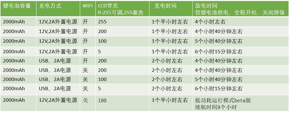 2、锂电池充放电 (1)推荐实际应用将LCD背光设置为100, 可以开机全程运行6个小时左右 (2)如果用不到WiFi,建议将WiFi关闭 (3)后面将推出低功耗运行模式,续航时间9个小时左右 支持外置电源或USB为锂电池充电