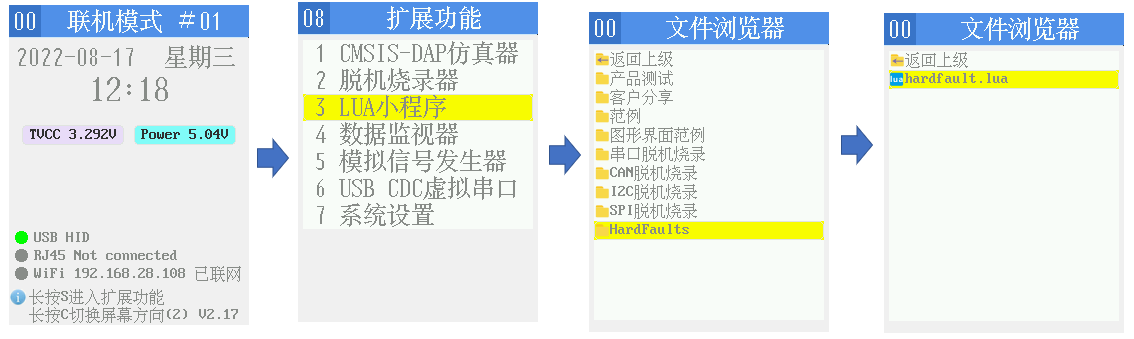 (1)H7-TOOL的Lua小程序功能是一个非常重要的功能。用户编写Lua小程序并下载到H7-TOOL内部,之后就可以脱离PC机执行。H7-TOOL的脱机烧录功能就是结合Lua小程序实现了复杂的业务逻辑。 (2)实现各种小程序,不再限制Flash里面已经下载的程序,就跟手机安装APP差不多,所以在H7-TOOL里面被广泛使用,支持在线调试运行,支持离线运行。 (3)支持USB,以太网和WiFi的在线控制运行和离线控制运行。且局域网和外网也可以控制。 应用场合