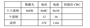 如上图: 0xFB 为数据头, 0x0C 为电压 12V, 0x10 为电流 1.6A