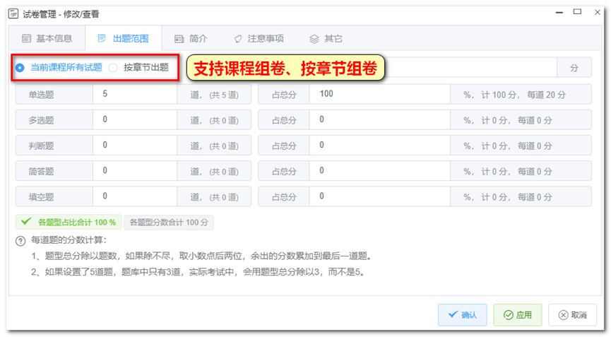 - 智能组卷:支持课程组卷、章节组卷、随机试卷、抽题试卷等多种模式。可根据知识点、难度系数灵活抽题,一键生成试卷,有效防止考场舞弊。