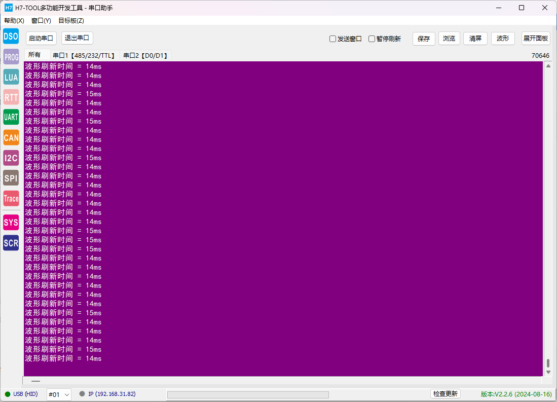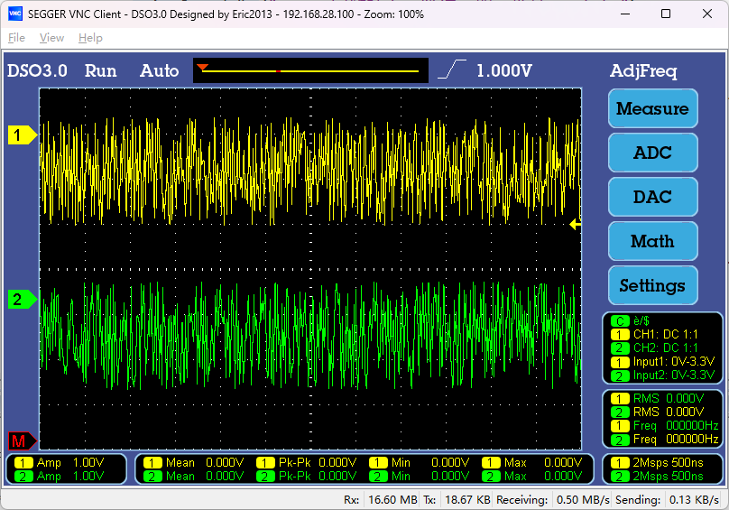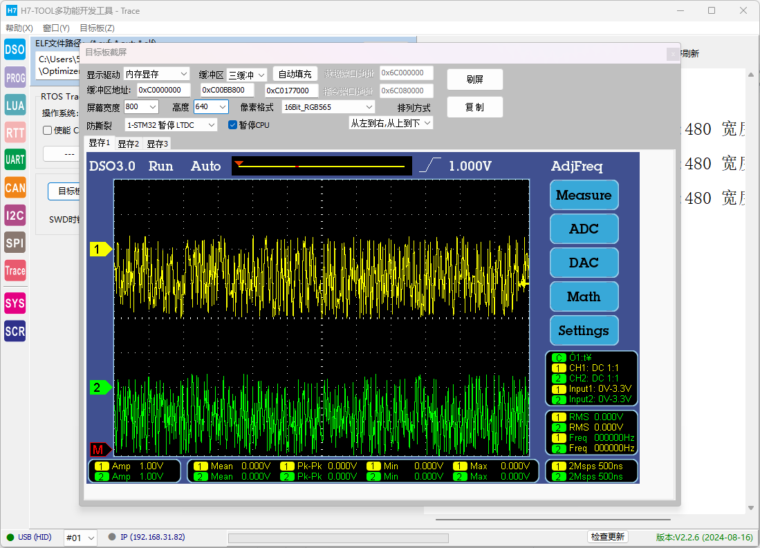 1、本来这段时间是一年一度Hackaday硬件设计开源盛宴,但hackaday电子大赛在去年终结了。所以我开源个我的吧。 2、三代示波器的高速波形刷新方案,前两年就做好了,这两年忙H7-TOOL的更新比较多,三代示波器的更新就搁置了。但刷新方案是没问题的,开源分享给大家。 3、V7板子主频400MHz时,整屏刷新一次双通道填充波形14ms一帧,超频到600M,可以破10ms一帧,即100Hz大关。 4、早期这个方案是使用emWin6.16版本制作,图库是ABGR格式,为了方便分享,继续使用这个版本。现在的emWin6.46只有ABGR格式库了,程序代码改动的地方比较多,所以没采用。 5、支持VNC远程,手机和pad端推荐使用RealVNC,电脑端使用SEGGER分享的VNC软件即可。