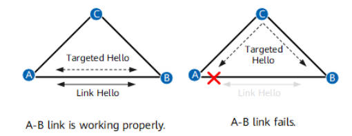 在未启用LDP的会话保护机制的时候,如果LDP对等体之间的链路故障,则LDP会话对断开,所有从对等体学到的标签映射都会被清除。启用了会话保护机制后,会额外使用Targeted Hello建立一个新的Hello邻接。当直连链路故障后,由于IP可达,Targeted Hello邻接没有收到影响,因此LDP的会话没有断开。