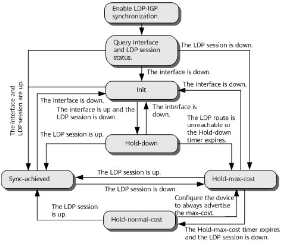 路由协议(OSPF,IS-IS,EIGRP)下启用IGP和LDP的同步功能。