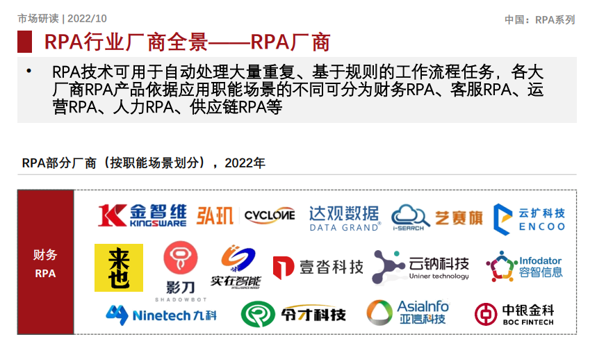 3. 迭代耐力:能跟上政策和系统更新 财务政策和票据规范几乎每年都有更新,系统端也会随之变化。因此,选择具备持续更新能力、平台化支撑的厂商至关重要。 根据《2022年中国RPA市场探析报告》,国内头部RPA厂商(如金智维、弘玑Cyclone、来也科技等)在产品创新和技术融合方面表现出更高的成熟度,而中腰部厂商则更专注于垂直领域(如电商、物流),技术栈相对单一,创新深度和生态支持较为有限。具体差距可能体现在:新发票字段标准上线后,有的厂商当天就能自动适配,有的则要等到下一季度。