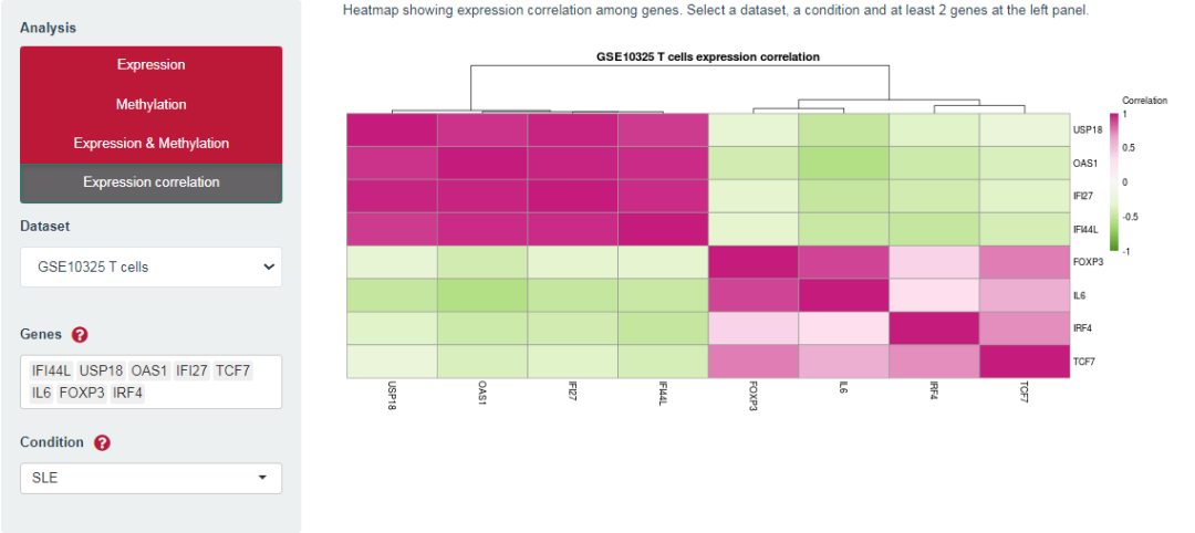 在ADEX数据库中通过Gene Query模块分析单个基因与其他基因共表达相关性分析。步骤:左侧选择【Analysis】模块选择Expression correlation , 【Dataset】选择SLE中GSE10325 T 细胞数据集,【Gene】模块输入需要分析的基因,【Condition】选择healthy 或者SLE。如图展示了IFI44L基因与其他基因共表达相关性热图。