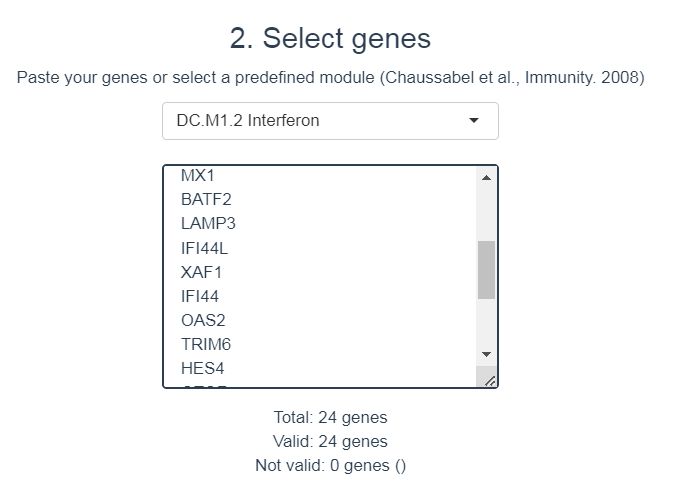 步骤2:Select genes :既可以自行输入需要检索的基因,又可以输入预定义的基因模块。该基因模块是根据SLE外周血基因芯片数据定义的转录基因模块。如果选择的DC.M1.2 Interferon 是24个干扰素相关基因,包括IFI44L在内。