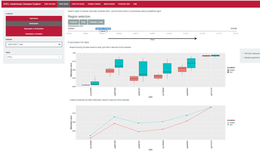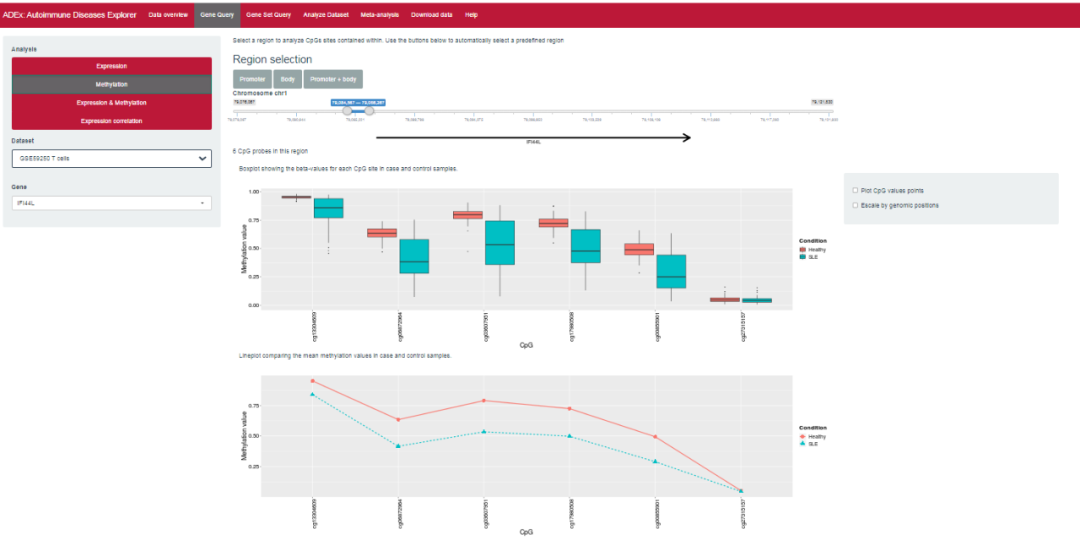 在ADEX数据库中通过Gene Query模块分析单个基因在特定疾病数据集的甲基化水平与健康对照差异。步骤:左侧选择【Analysis】模块选择Methylation , 【Dataset】选择SLE中的T细胞数据集GSE59250,【Gene】模块输入需要分析的基因IFI44L,右侧【Region selection】有三个选择项,通常选择Promoter 启动子区域(或者自行选择区域)。即可出现健康对照与SLE之间IFI44L在启动子区域不同CpG岛甲基化水平情况,图片可另存为png格式。