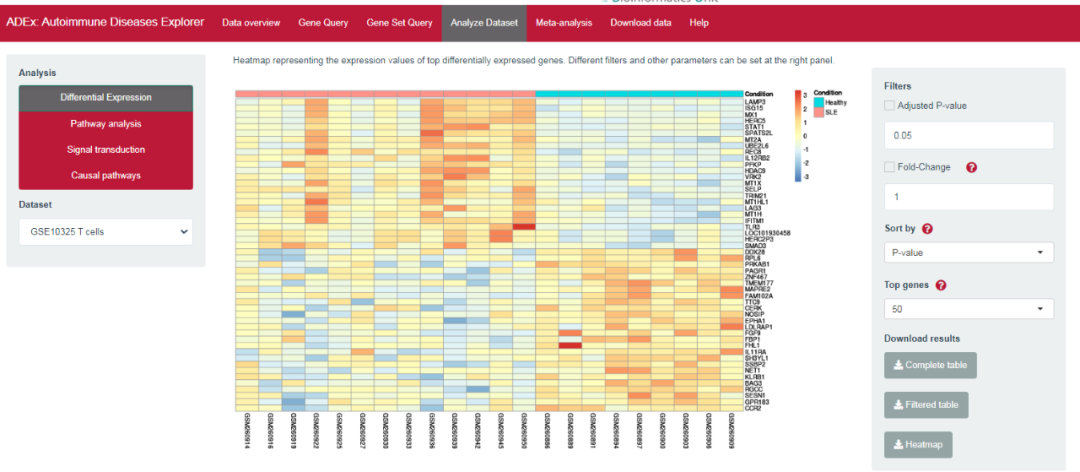 ADEX不仅提供基本的查询和分析功能,还集成了更高级的分析工具,如HiPathia软件用于信号传导网络分析,以及CARNIVAL软件用于因果网络推断。这些工具帮助研究人员更深入地理解自身免疫性疾病的分子机制。