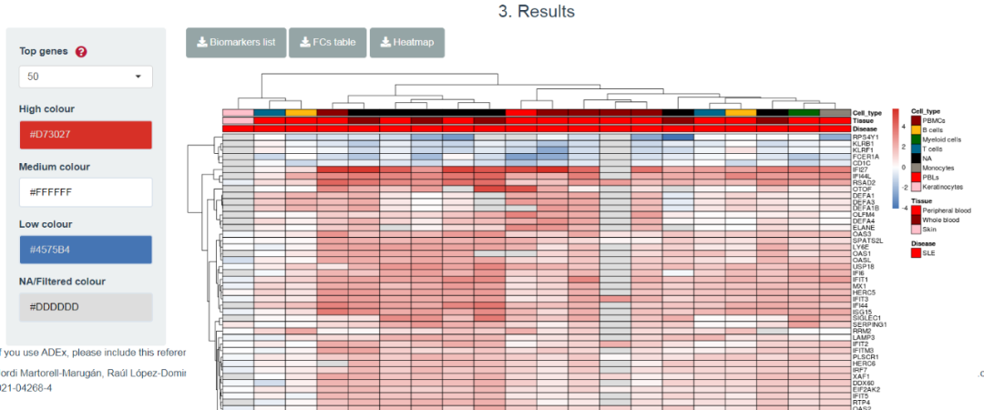 通过使用ADEX,研究人员可以轻松地探索IFN(干扰素)特征在不同疾病中的表达情况。例如,研究发现IFN特征在SLE和SjS患者中显著过表达,而在RA患者中表现出异质性。这一发现支持了IFN在自身免疫性疾病中的重要作用,并为未来的治疗策略提供了线索。