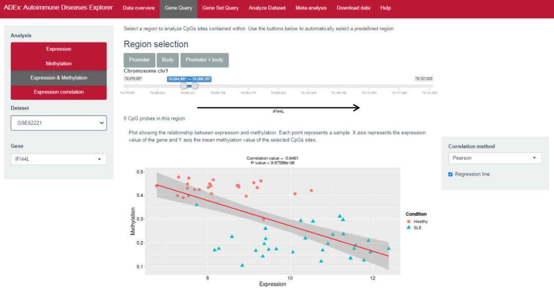 在ADEX数据库中通过Gene Query模块分析单个基因甲基化水平与基因表达相关性分析。步骤:左侧选择【Analysis】模块选择Expression &Methylation , 【Dataset】选择SLE中GSE82221(目前只有两个相关数据集可选),【Gene】模块输入需要分析的基因IFI44L,上侧【Region selection】有三个选择项,通常选择Promoter 启动子区域(或者自行选择区域),右侧【Correlation method】有三种相关性分析方法,默认 Pearson。如图IFI44L基因表达与IFI44L启动子区域CpG岛甲基化水平相关性,图片可另存为png格式。