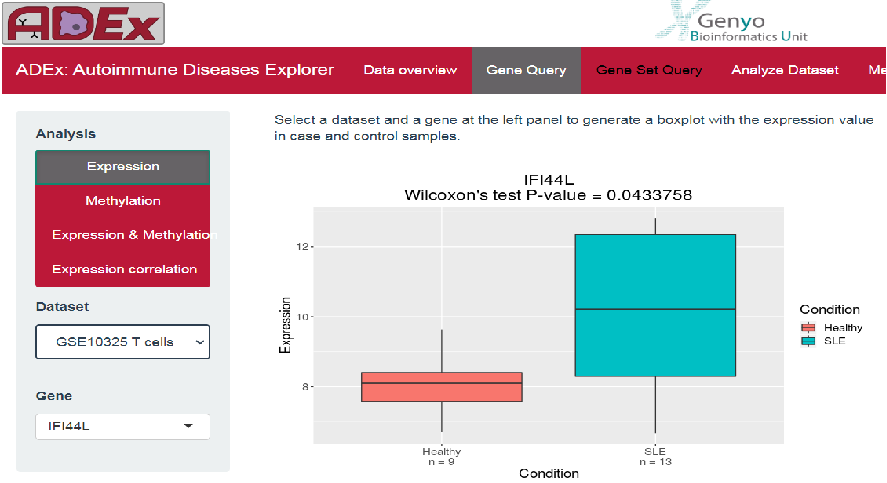 在ADEX数据库中通过Gene Query模块分析单个基因在特定疾病与健康人之间基因表达情况,步骤:左侧选择【Analysis】模块选择Expression , 【Dataset】选择SLE中的T细胞数据集GSE10325,【Gene】模块输入需要分析的基因IFI44L,右侧即可出现健康对照与SLE之间IFI44L的表达箱线图及 统计差异结果。