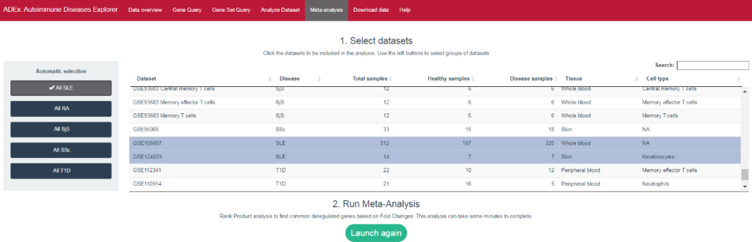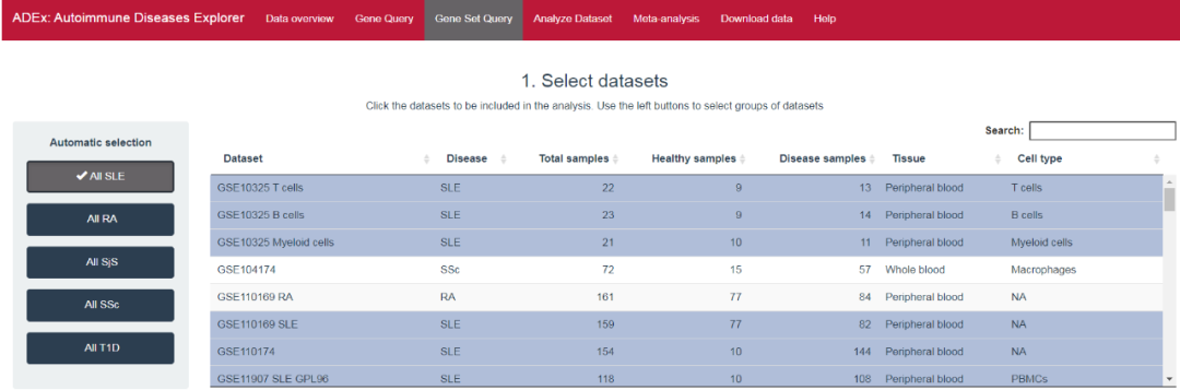 在ADEX数据库中通过【Gene set Query】模块分析单个基因与其他基因共表达相关性分析。 步骤:1. Select datasets;选择数据集,可通过左侧【Automatic selection 】模块选择ALL SLE , 这是所有SLE数据集被选择,如图可知,数据集信息包括GSE号,疾病类型、样本数,组织、细胞类型。可通过点击数据集进行添加与取消,这样可以选择目的数据集类型。