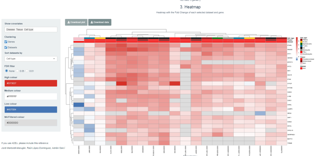 步骤3:Heatmap:热图展示,当选择目的数据集与基因后,自动生成热图。左侧有【Show covariates】可添加数据集的信息,如疾病、组织、细胞类型信息,【Clustering】可对Genes与Datasets进行行与列双向聚类展示。【FDR filter】过滤数据集,通常默认None.其他是热图颜色范围设置。热图通过Download plot 可下载为PDF图片,Download table可下载热图矩阵数据表格。