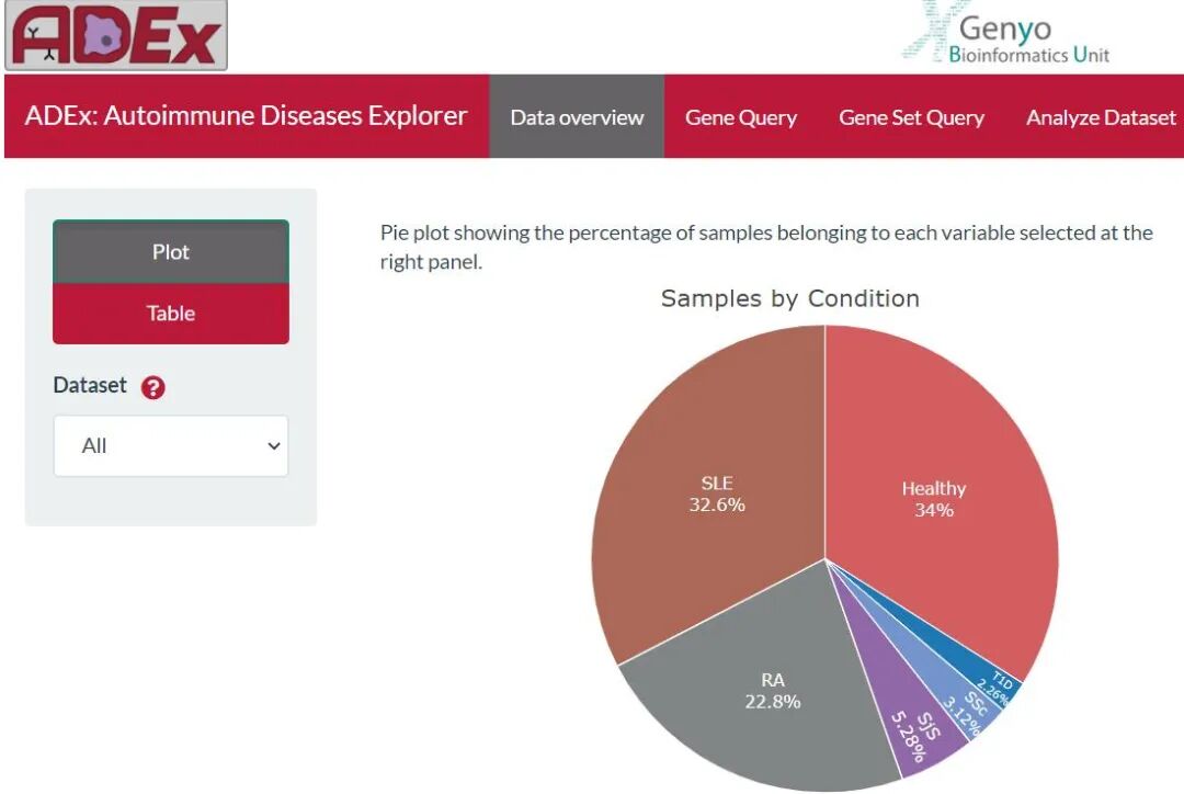 ADEX是一个综合性的数据库,专注于自身免疫性疾病的组学数据分析。该网站集成了82项经过精心策划的转录组和甲基化研究,涵盖了5609个样本,涉及系统性红斑狼疮(SLE)、类风湿性关节炎(RA)、干燥综合征(SjS)、系统性硬化症(SSc)和1型糖尿病(T1D)等常见自身免疫性疾病。ADEX提供易于使用的环境,集成了高级数据分析和统计方法,以便研究人员探索组学数据集,包括元分析、差异表达分析和通路分析等。