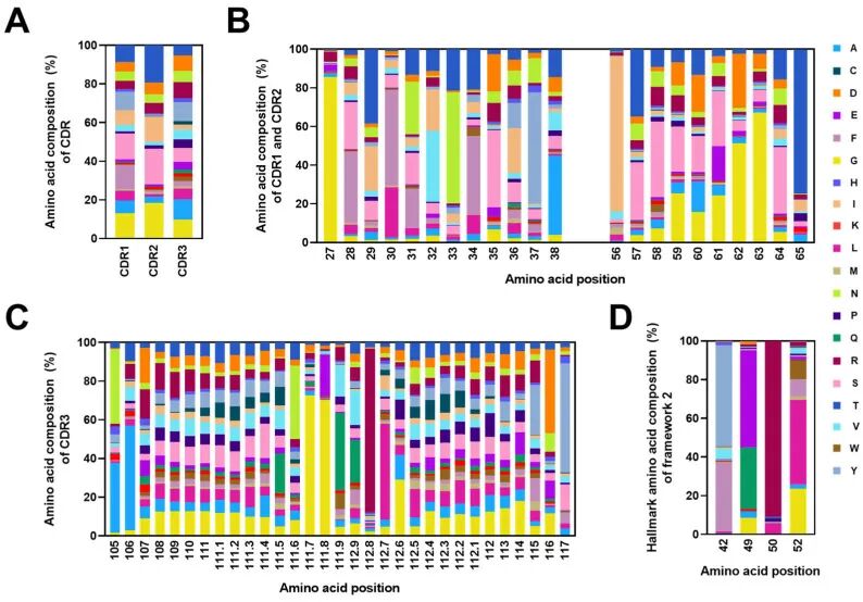 图4:VHH的CDR和FR2的氨基酸组成。(A)对CDR1、CDR2和CDR3完整序列的氨基酸组成进行综合分析。(B,C)深入研究CDR1, CDR2, CDR3中每个位置的氨基酸组成。(D) FR2中42、49、50和52位特征氨基酸组成的详细分析。在所有图(A-D)中,CDR和FR2中的氨基酸组成以百分比表示,并以不同颜色的堆叠条形显示。每个堆叠的条形图代表每个氨基酸在特定位置的比例。x轴表示氨基酸的位置与IMGT的编号一致。