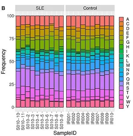 图3:SLE与对照组之间不同样本之间CDR氨基酸使用频率的比较