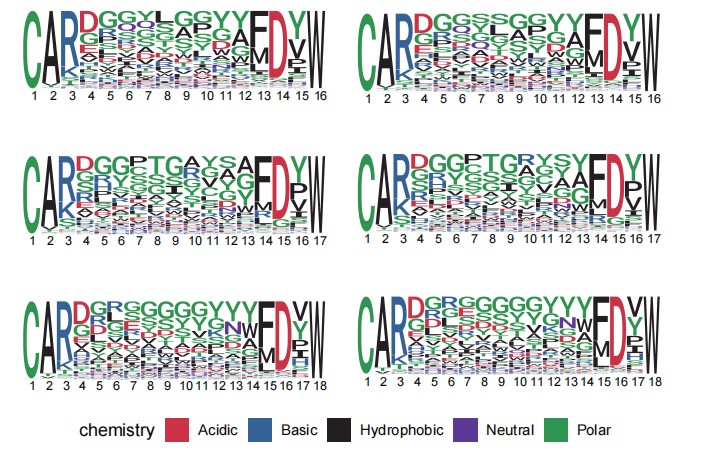 CDR3 氨基酸motif比较通常选择特定长度进行。一般选择组间有显著差异的CDR3 长度。如下图所示,左边与右边分别为不同组。CDR3的氨基酸长度分别为16、17与18。然后展示了CDR3 氨基酸motif的特征。通常两端的氨基酸较为保守,而中间的氨基酸多样性大。不同氨基酸按照化学性质标记为不同颜色。