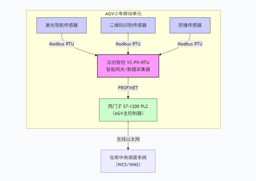 在这个拓扑中,远创智控YC-PN-RTU网关扮演了AGV内部“通讯枢纽”的角色。它作为一个高效的数据采集器,将所有Modbus传感器数据汇聚,并打包成标准的PROFINET数据帧,供主控PLC实时读取和控制。