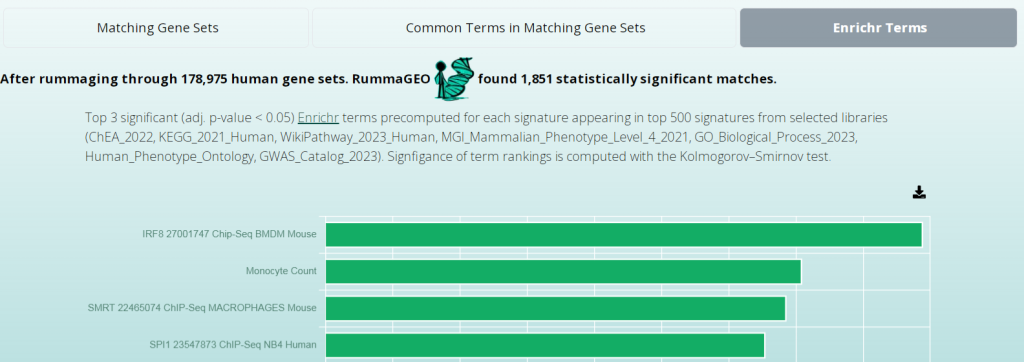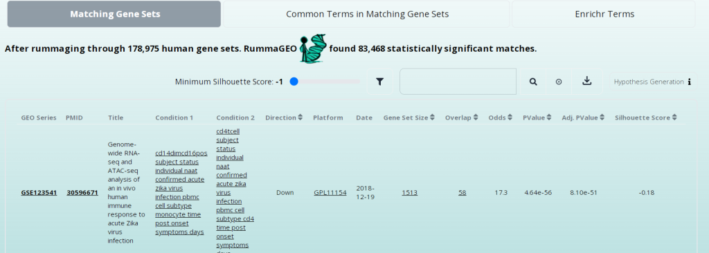 步骤2:查看匹配的基因集结果。如下图所示,在178,975个基因集中,共有83,468个基因集有显著性富集。结果可以通过下载按钮进行下载,也可以点击表格中具有下划线的文字进行GEO数据集的查看。