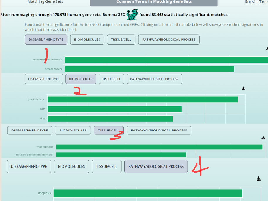步骤3:对富集的前5000个GSE数据集基因进行概括,就是这些基因集在多层次的富集分析结果。1是疾病与表型富集结果。2是分子类型。3是组织细胞.4是通路与生物学过程。