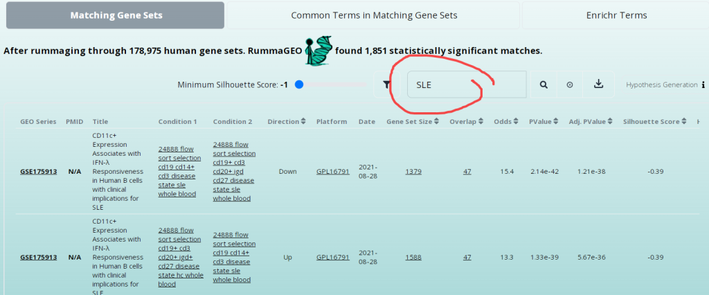 步骤5:筛选与特定疾病相关的GEO数据集。由于我们进行差异基因集研究时候,这个数据集通常来自特定类型,如细胞类型、疾病类型、组织类型等等。这样更好的找到符合我们要求的数据集进行下游调控转录研究。因此我们这里在输入框填写了SLE。系统性红斑狼疮。基因集从八万多个减少到1851个基因集。这个时候我们对表格结果进行下载。然后在电子表格中进行进一步筛选。如选择细胞类型或者基因名称等筛选。